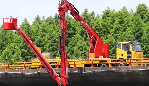 รูปที่ 1.14 เป็นรถที่ใช้ในการตรวจสอบสภาพสะพาน โดยใช้ระบบไฮดรอลิกในการควบคุมแขนแกว่งเลื่อนไปมา ซึงเป็นที่ติดตั้งกระเช้าให้แขวนตัวอยู่เพื่อใช้เป็นห้องตรวจสอบและบำรุงรักษา รวมทั้งแขนลอดใต้สะพานซึ่งสามารถยืดออกได้ถึง 20 เมตร
