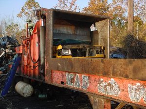 รูปที่ 1.6 เป็นเครื่องอัดที่ใช้อัดชิ้นส่วนของรถยนต์เก่าให้ยุบเป็นชิ้นเดียวกัน เครื่องจักชนิดนี้ทำงานด้วยระบบไฮดรอลิก ประกอบด้วยการทำงาน 3 ขั้นตอนคือ การยกชิ้นส่วนและตัด จากนั้นก็จะเป็นการอัดด้วยแรงดันในแนวตั้ง และขั้นตอนสุดท้ายคือ การอัดด้วยแรงดันในแนวขวาง และส่งชิ้นส่วนที่ยุบเป็นเศษโลหะไปยังสะพานลำเลียงต่อไป