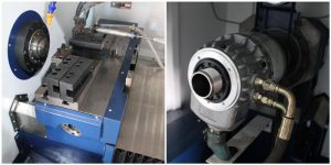 รูปที่ 1.8 เป็นเครื่องเจียระไนชิ้นงาน มีตำแหน่งให้เลือกทำงาน 4 ตำแหน่งและหมุนได้ 2 ทิสทาง ซึ่งใช้ในการเจียรเฟือง อุปกรณ์ 2 ตัวในเครื่องนี้ทำงานด้วยระบบไฮดรอลิกคือ ตัวจับยึดชิ้นงานและแท่นหมุนทำงานด้วยระบบไฮดรอลิก