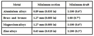 วัสดุที่ใช้กำหนดความหนาของส่วนขั้นต่ำและแบบร่างขั้นต่ำที่จำเป็นสำหรับการหล่อตามที่ระบุไว้ในตารางด้านล่าง ส่วนที่หนาที่สุดควรน้อยกว่า 13 มม. (0.5 นิ้ว) แต่สามารถมากกว่าได้