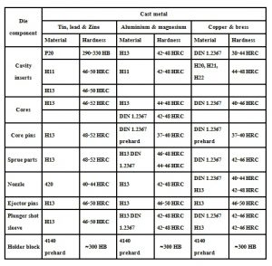 คุณสมบัติของวัสดุที่สำคัญที่สุดสำหรับแม่พิมพ์คือการทนต่อแรงกระแทกจากความร้อนและการอ่อนตัวที่อุณหภูมิสูงขึ้น คุณสมบัติที่สำคัญอื่น ๆ ได้แก่ ความสามารถในการชุบแข็งความสามารถในการแปรรูปความต้านทานการตรวจสอบความร้อนความสามารถในการเชื่อมความพร้อมใช้งาน (โดยเฉพาะสำหรับแม่พิมพ์ขนาดใหญ่) และต้นทุน อายุการใช้งานของแม่พิมพ์จะขึ้นอยู่โดยตรงกับอุณหภูมิของโลหะหลอมเหลวและรอบเวลา แม่พิมพ์ที่ใช้ในการหล่อตายมักทำจากเหล็กกล้าเครื่องมือชุบแข็งเนื่องจากเหล็กหล่อไม่สามารถทนต่อแรงกดดันสูงที่เกี่ยวข้องได้ดังนั้นแม่พิมพ์จึงมีราคาแพงมากส่งผลให้ต้นทุนในการเริ่มต้นใช้งานสูง โลหะที่หล่อด้วยอุณหภูมิที่สูงขึ้นต้องใช้แม่พิมพ์ที่ทำจากเหล็กอัลลอยด์ที่สูงกว่า