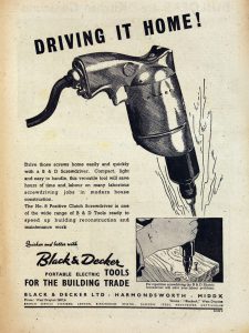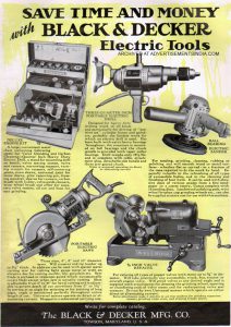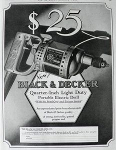 ในปี 1921 Black+Decker บริษัท ได้ทำการโฆษณาเต็มหน้าใน Saturday Evening Post โดยตั้งเป้าไปที่ตลาดผู้บริโภคในประเทศ จากประวัติของบริษัท ในปี 1923 เป็นปีที่เริ่มนำเสนอสว่านไฟฟ้าแบบพกพาราคาถูกให้กับองค์กรที่ไม่แสวงหากำไร บริษัท ได้สร้างห้องเรียนเคลื่อนที่ในรถโดยสารเพื่อสอนผู้จัดจำหน่ายเกี่ยวกับการใช้และการขายสว่านไฟฟ้าและเครื่องมือไฟฟ้าต่างๆ
